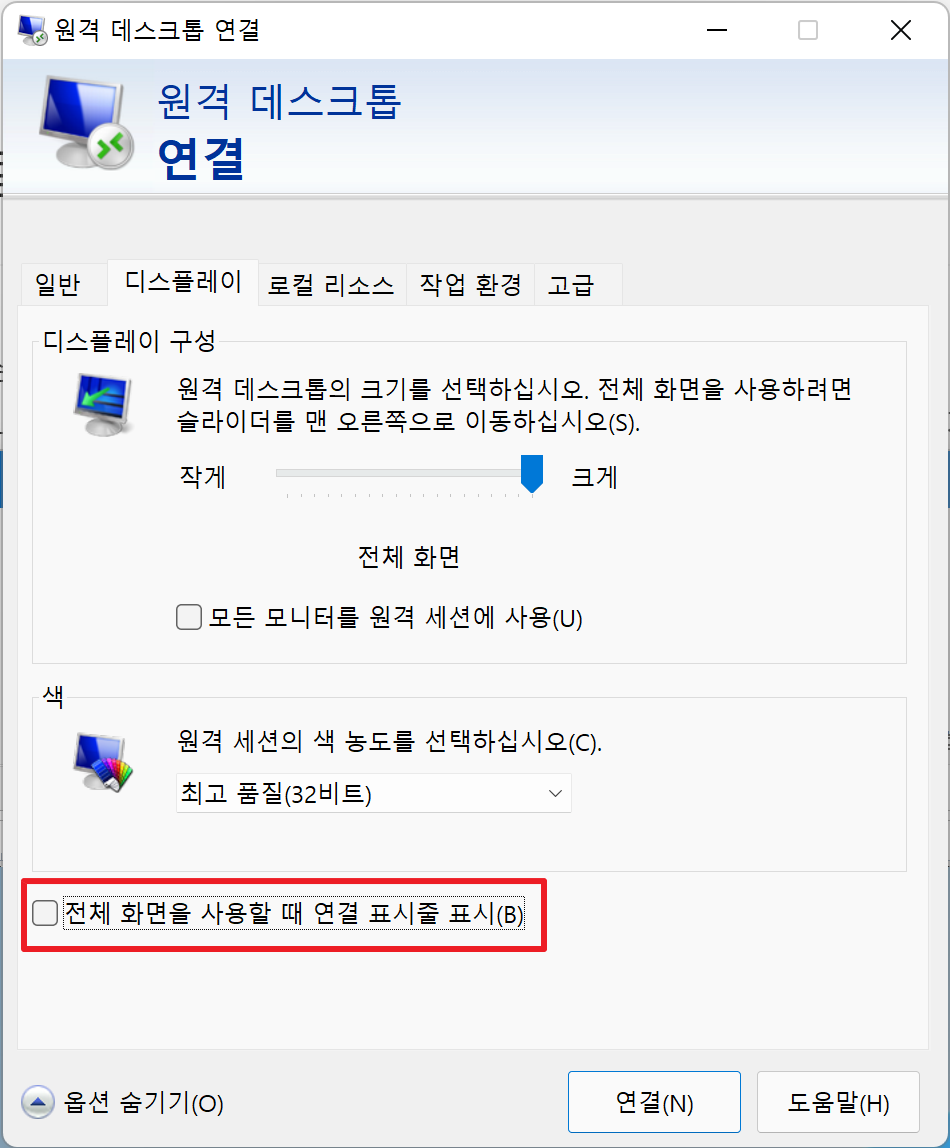 원격 데스크톱 연결 > 디스플레이 > [전체 화면을 사용할 때 연결 표시줄 표시] 항목 체크 해제