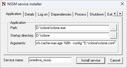 Arguments | mount onedrive_music:/music z: --cache-dir=D:\rclone_cache --vfs-cache-mode full --vfs-cache-max-age 168h --config "D:\rclone\rclone.conf" |