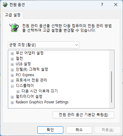 그러면 전원 옵션의 고급전원관리 화면이 바로 열린다.
