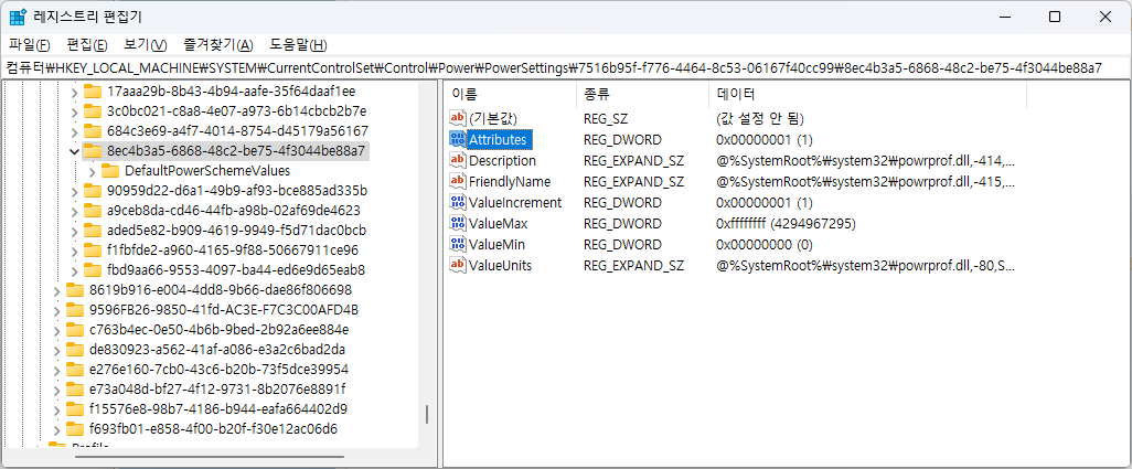 reg 파일을 실행하면 아래 위치의 Attributes DWORD 값이 1에서 2로 변경된다.