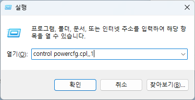 그 후, 시작버튼 우클릭 -> 실행 -> 아래와 같이 입력한다. (control powercfg.cpl 뒤에 쉼표쉼표1)